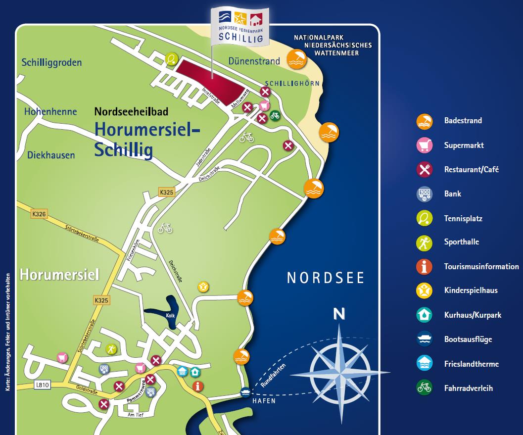 Schillig liegt etwa 20 Kilometer nördlich von Wilhelmshaven und zwei Kilometer nördlich von Horumersiel. Die besondere geografische Lage schenkt Schillig das maritime Reizklima sowie den langen Natur-Sandstrand.